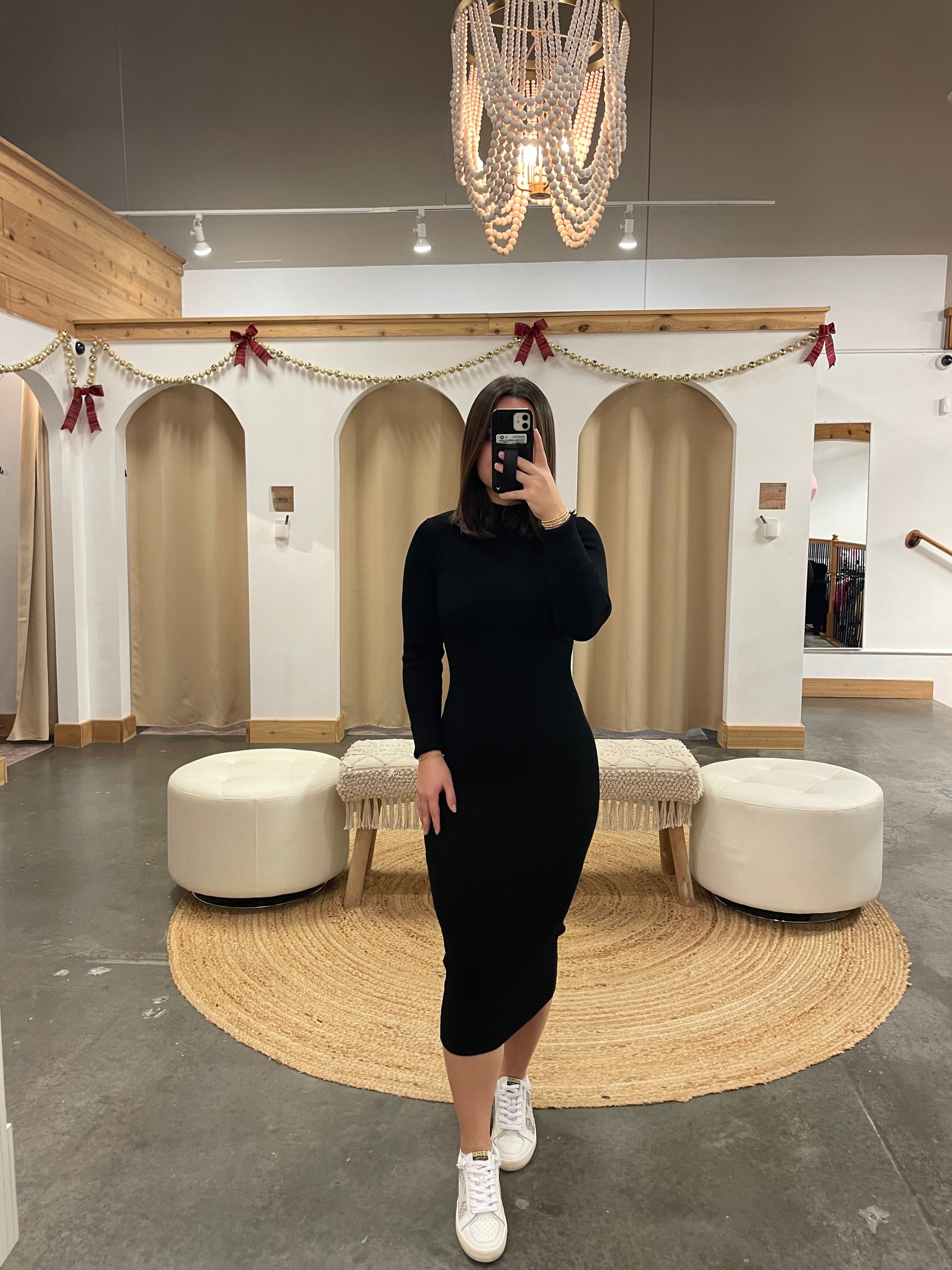 Introducing the Kaylen Midi Sweater Dress. This bodycon dress features a flattering mock neck and a soft, cozy sweater knit material. Perfect for staying stylish and comfortable during the colder months. Elevate your wardrobe with this versatile piece. Runs true to size with a stretch fit.