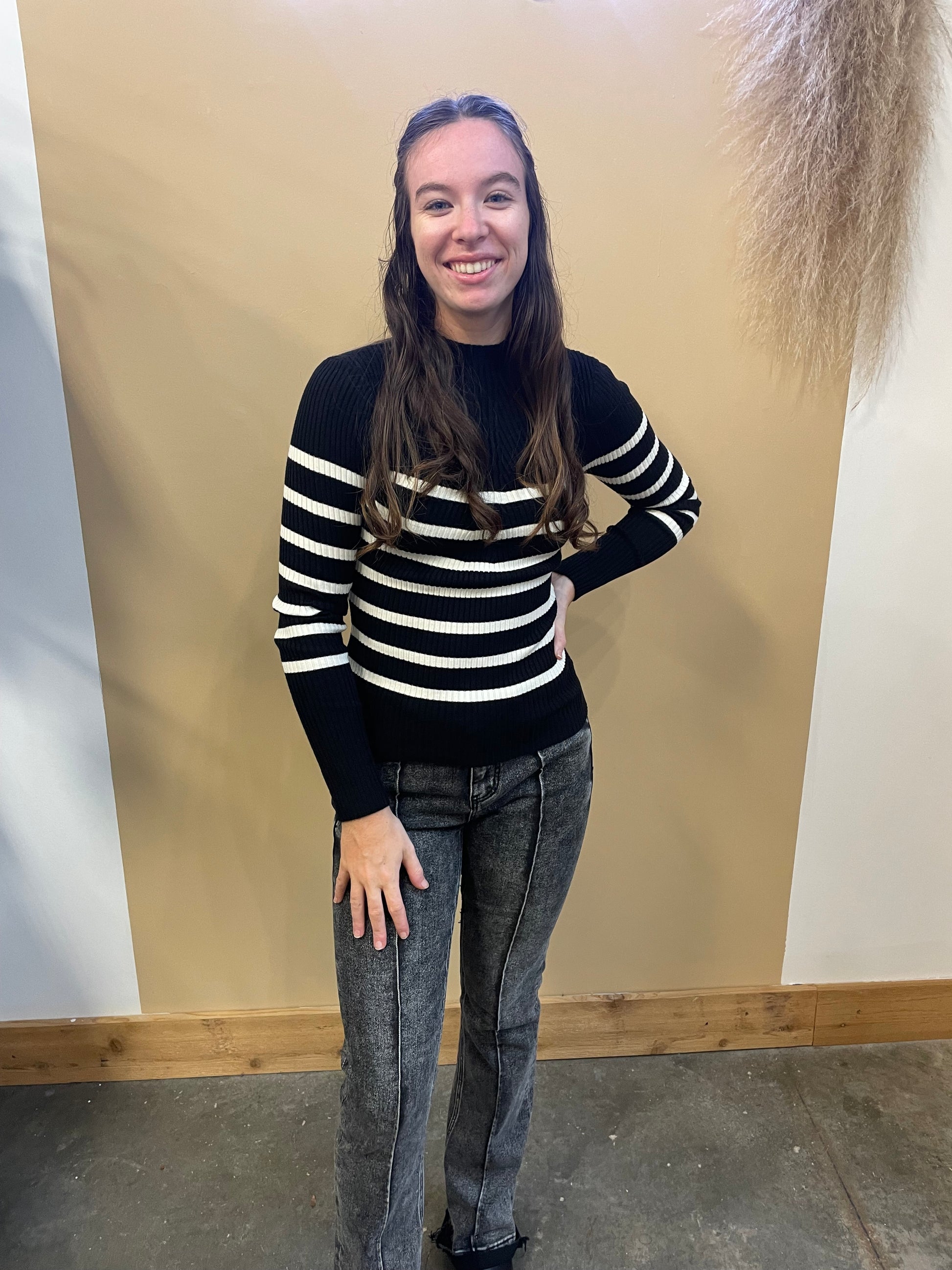 Upgrade your wardrobe with our Long Sleeve Stripe Sweater! This knit sweater features a stylish stripe design and a cozy mock neck. Perfect for staying warm and fashionable this season. Elevate your style with our must-have sweater! Runs true to size