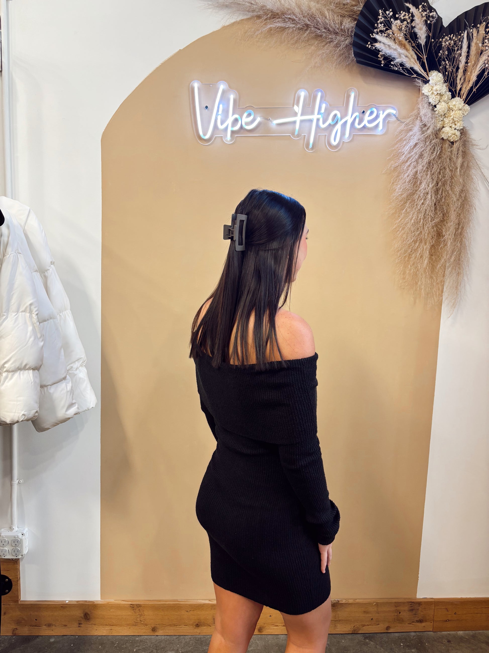 Indulge in effortless style with our Off-Shoulder Sweater Dress. Made from a ribbed knit material, this dress features a trendy off-shoulder design and long sleeves for a flattering silhouette. Perfect for both casual and dressy occasions, this dress will elevate your wardrobe and keep you comfortable all day long. Sleeves are purposely long but can of course be rolled up. Comfortable stretchy material. Runs true to size.