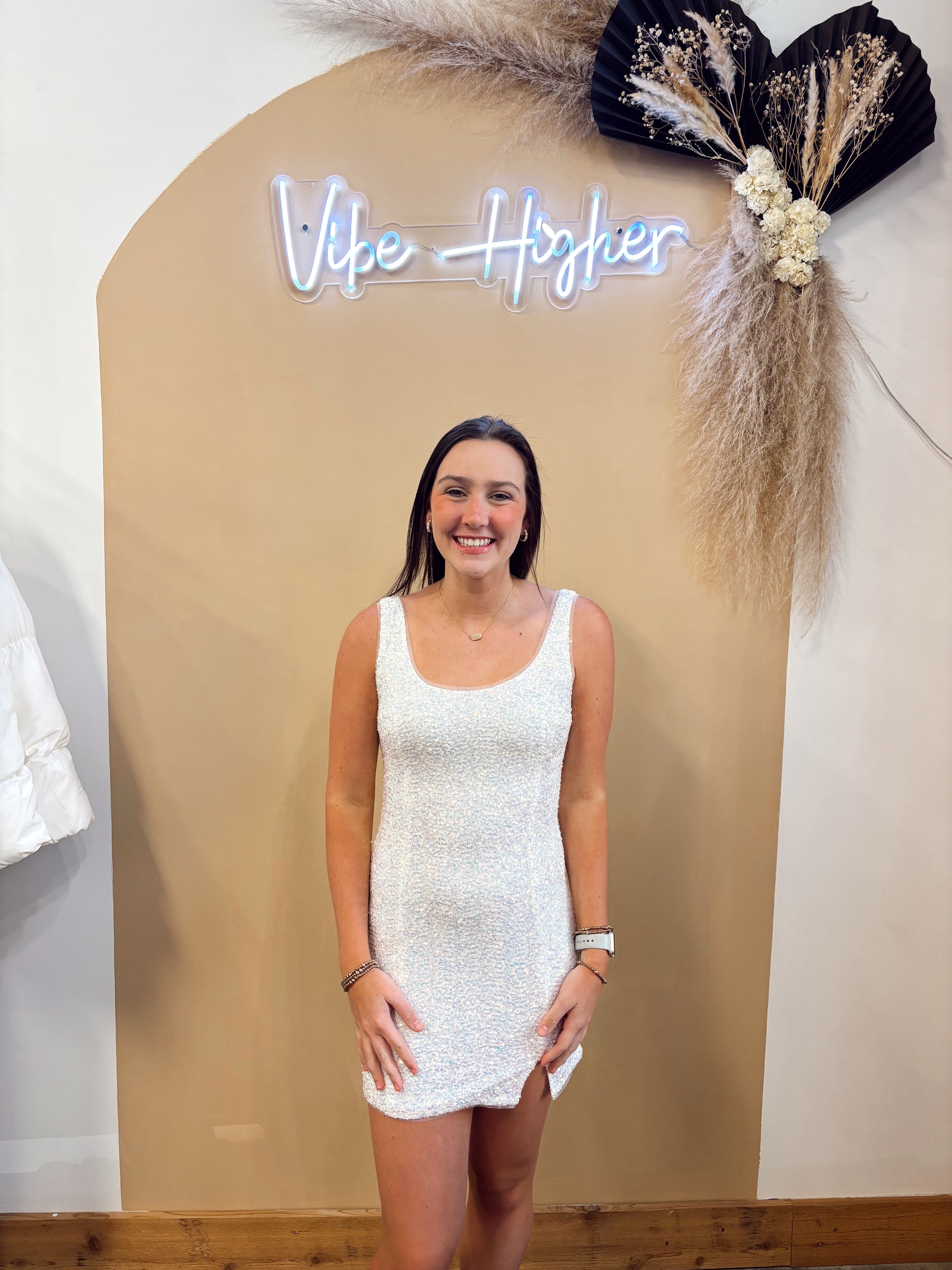 Sparkle and shine in our "Sally Sequin Dress"! This multi-color, sleeveless mini dress is adorned with sequins for a glamorous look. The back zipper adds convenience and comfort. Stand out in style and turn heads at any event. Dress is very comfortable. Stretchy material. Model in a size Large.